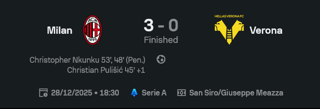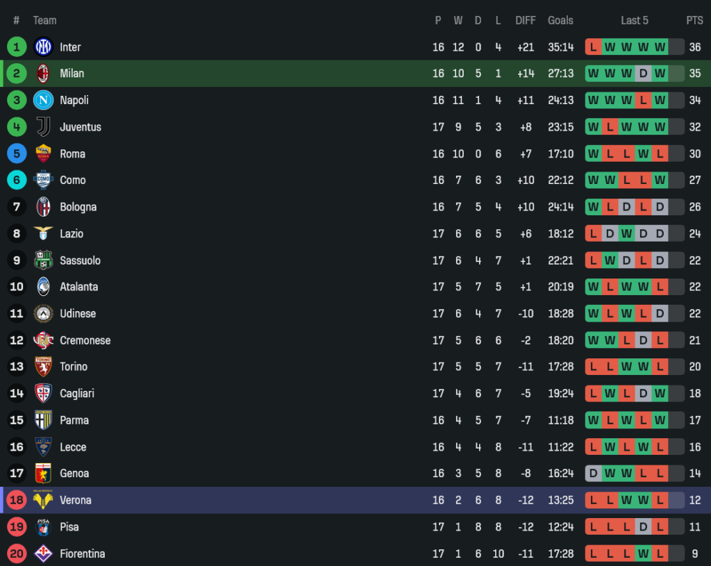 - หลังจบนัดนี้ มิลานเก็บเพิ่มเป็น 35 แต้ม ไล่จี้จ่าฝูงอินเตอร์เหลือแต้มเดียว ส่วนเวโรน่าจมโซนหนีตกชั้นที่ 18 มีแค่ 12 แต้ม