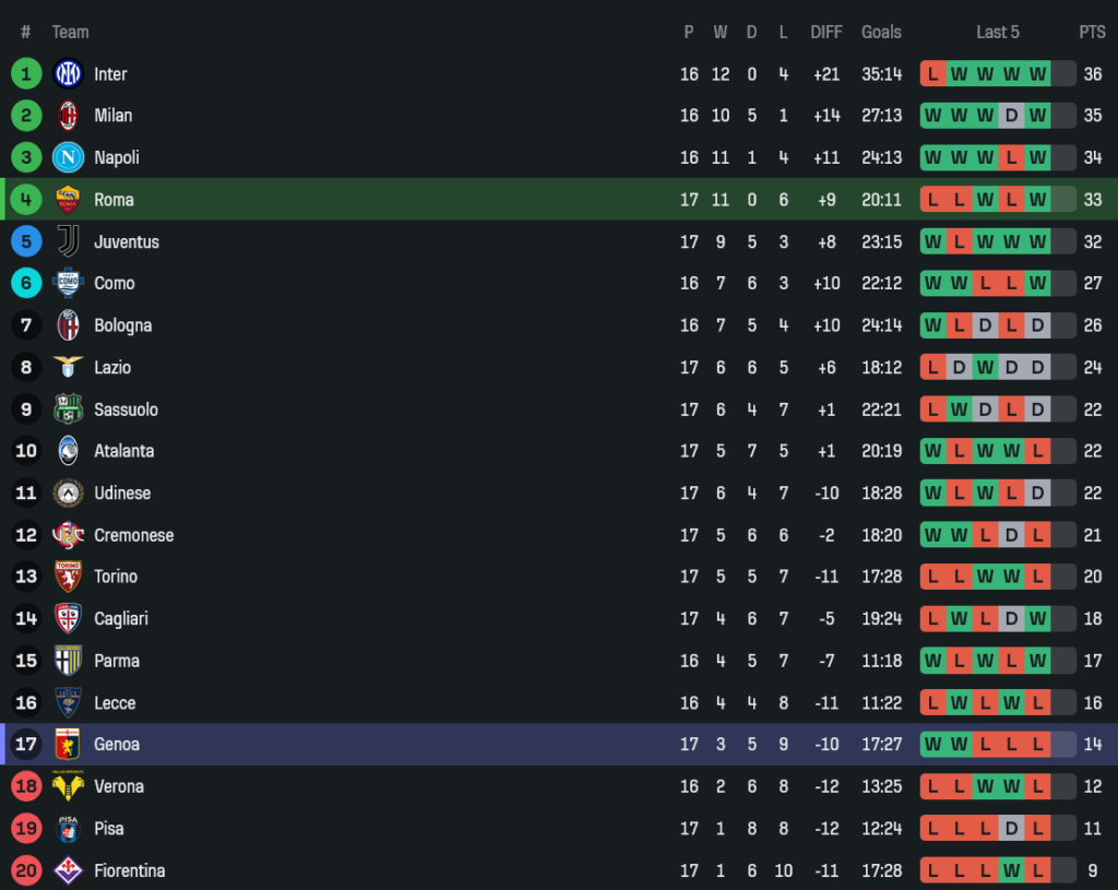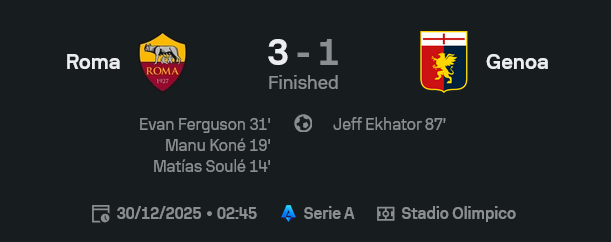 ชัยชนะนัดนี้ดันโรม่าขึ้นไปรั้งกลุ่มบนของตารางต่อเนื่อง มีลุ้นพื้นที่ยุโรปยาว ๆ ส่วนเจนัวที่อยู่โซนหนีตกชั้น งานนี้ต้องกลับไปเคลียร์เกมรับใหม่ทั้งหมด เพราะถ้ายังปล่อยให้คู่แข่งบุกง่ายขนาดนี้ เจอทีมใหญ่ทีไรมีสิทธิ์เละทุกนัด