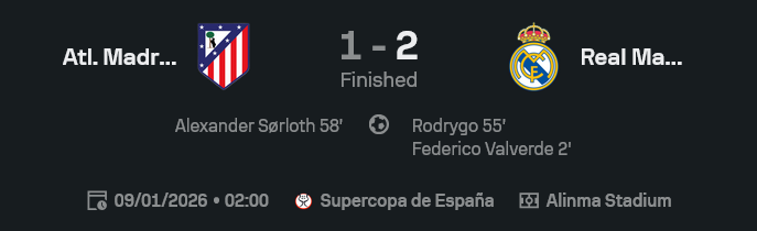 คืนดวลเดือดที่ Alinma Stadium แอตเลติโก มาดริด ของดีเอโก้ ซิเมโอเน่ เปิดศึกกับ เรอัล มาดริด ในรอบตัดเชือก ซูเปร์โกปาเดเอสปัญญา 2025/26 รูปเกมหลายช่วงเหมือน ผลบอลสด แกล้งแฟนตราหมี เพราะบุกเยอะ ยิงเยอะ แต่สุดท้ายโดนราชันชุดขาวเล่นงานด้วยความคมและนิ่งกว่า จบ 90 นาที ราชันชนะ 2-1 ทะลุเข้าชิงแบบหน้าตาย