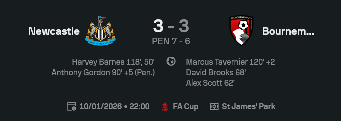 เกมนี้ที่เซนต์ เจมส์ พาร์ก แฟนสาลิกาดงหัวใจเกือบวายกันทั้งเมือง สกอร์ในเวลา 120 นาทีเสมอ 3-3 ก่อนนิวคาสเซิ่ลยิงจุดโทษแม่นกว่าชนะ 7-6 เข้ารอบเอฟเอ คัพ แบบลุ้นตัวเกร็ง เรียกว่าสายเช็ก ผลบอลสด ต้องไถจอรัว ๆ กันเลย