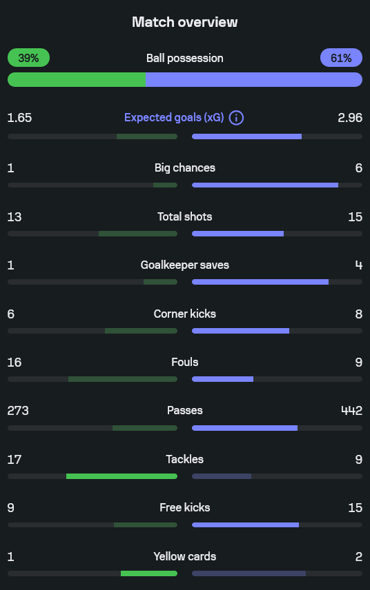 - ยิงทั้งหมด: เจ้าบ้าน 13 ครั้ง ทีมเยือน 15 ครั้ง ใกล้เคียง แต่คุณภาพจบสกอร์ต่างกันคนละโลก