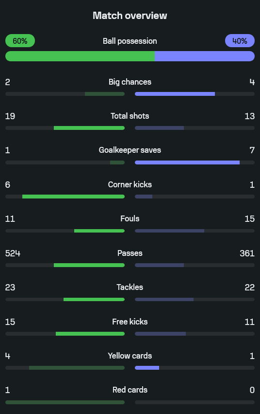 - โอกาสยิงทั้งหมด: ผีแดง 19 ครั้ง – นกนางนวล 13 ครั้ง