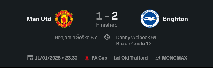 เอฟเอ คัพ อังกฤษ รอบเดือดที่โอลด์ แทรฟฟอร์ด แฟนผีเปิดจอรอเฮ สุดท้ายโดนไบรท์ตันบุกมาตบหน้าคาบ้าน 1-2 แบบสกอร์จาก ผลบอลสด ไม่ได้โกหก นาที 12 บรายาน กรูดา ซัดนำให้ทีมเยือน ก่อนแดนนี่ เวลเบ็ค อดีตเด็กเก่าเพิ่มแผลลึกเป็น 0-2 นาที 64 ผีแดงไล่มา 1-2 จากเบนจามิน เซสโก้ นาที 85 แต่ก็สายไปแล้ว แถมทดเจ็บยังมาเหลือ 10 คนเพราะ เชีย เลซีย์ โดนไล่ออก เกมนี้เจสัน สตีล เซฟจนกองหน้าผีเริ่มมองหาประตูอีกฝั่งว่ามีเวทมนตร์อะไรหรือเปล่า