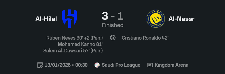 - ยิงรวม อัล ฮิลาล 8 ครั้ง อัล นาสเซอร์ 9 ครั้ง แต่ฝั่งที่เฉียบกว่ายิงเข้ากรอบน้อยกว่าแต่ได้สามลูก