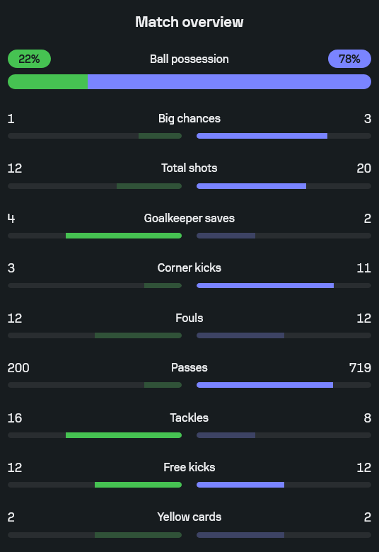 • โอกาสยิงทั้งหมด: เจ้าบ้าน 12 ครั้ง – ทีมเยือน 20 ครั้ง
