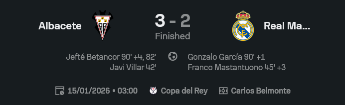 ถ้าดูแต่ตัวเลขแล้วมองไม่เห็นสกอร์ คุณต้องเดาไปทางเรอัล มาดริดชนะสบายแน่ๆ ครองบอลเกือบ 80% ยิงมากกว่าสิบครั้ง แต่บอลถ้วยมันโหดอย่างนี้แหละ เล่นเนือยๆ เหมือนซ้อมใหญ่ก็พร้อมโดนสวนกลับไปนอน เกมนี้คือบทเรียนสดๆ ร้อนๆ ให้ อาร์เบลัว ว่าการโรเตชั่นทีมสำรองแล้วบุกเพลินแต่ไม่คม สุดท้ายโดนบอลดักโต้ของอัลบาเซเต้ลงโทษเต็มๆ