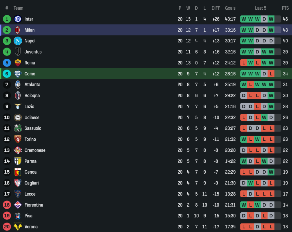 - ชัยชนะนัดนี้ทำให้มิลานเกาะที่ 2 ตารางต่อไป ไล่ตามอินเตอร์แค่ไม่กี่แต้ม ส่วนโคโม่ยังอยู่โซนลุ้นพื้นที่ยุโรปแบบมีลุ้นต่อ
