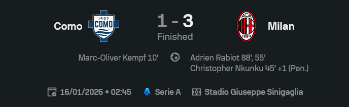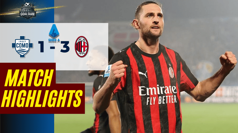 เกมนี้เปิดมาเหมือนหนังคนละม้วน โคโม่ครองบอลบุกยับ นำก่อนจากลูกโหม่งของ มาร์ค-โอลิเวอร์ เคมป์ฟ แต่ดันมาเจอความนิ่งของตัวใหญ่ฝั่งมิลาน ทั้ง คริสโตเฟอร์ เอ็นคุนคู ที่ซัดจุดโทษตีเสมอ และ อาเดรียง ราบิโอต์ ที่เหมาคนเดียวสองเม็ด พลิก ผลบอลสด จากตามหลังกลายเป็นบุกชนะ 1-3 เก็บสามแต้มสำคัญ ไล่กดดันอินเตอร์ต่อเนื่อง ส่วนโคโม่ที่ฟอร์มดีดันพลาดโดนบทเรียนเรื่องความเฉียบคมไปเต็ม ๆ