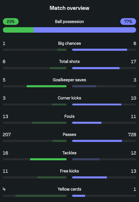 - ครองบอล: ราซิ่ง 23% – 77% บาร์เซโลนา (บาร์ซ่าตั้งวงจ่ายบอลจนหญ้าเริ่มงอน)