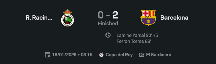 คืนบอลถ้วย ผลบอลสด จากศึกโกปา เดล เรย์ ที่บ้านของราซิ่ง ซานตานเดร์ กลายเป็นเวทีซ้อมใหญ่ของเด็กบาร์ซ่า เจ้าถิ่นวิ่งไล่เพรสเหมือนจะเอาชีวิต แต่สุดท้ายยืนรับทั้งเกมแล้วโดนทีเด็ดความนิ่งของทีมเยือน บาร์เซโลนา กดสองดอกเนียน ๆ ชนะ 2-0 แบบเล่นเหมือนซ้อมครึ่งสนาม
