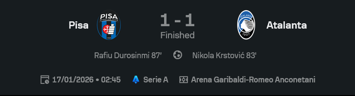 ถ้ามองด้วยสายตาคนดูบอลตัวจริง เกมนี้คือบทเรียนของทีมลุ้นยุโรปที่คิดว่ามาเจอทีมโซนแดงแล้วจะจบงานง่ายๆ อตาลันต้าเล่นทรงคุมบอลเนียน ลำเลียงเกมรุกโอเค แต่จังหวะสุดท้ายออกทะเลบ่อย จนต้องรอหมัดเด็ดจากครัสโตวิชท้ายเกม ขณะที่พิซ่าเล่นแบบไม่มีอะไรจะเสีย ไล่บี้กลางสนามดุดัน กัดไม่ปล่อยจนได้ประตูตีเสมอจากดูโรสินมี ถือว่าตามแท็กติกแล้วสมองเย็นกว่าด้วยซ้ำ
