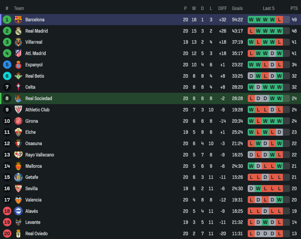 - หลังจบเกม บาร์ซ่ายังนำจ่าฝูงแต่โดนเรอัล มาดริดไล่จี้เหลือแต้มเดียว ส่วนโซเซียดาดขยับแต้มลุ้นกลุ่มครึ่งบน มีสิทธิ์เบียดพื้นที่ยุโรปถ้าเร่งเครื่องต่อเนื่อง