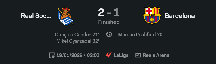 - ช่วงท้าย โซเซียดาดเหลือ 10 คนแต่ยืนเกมรับกันเป็นแนวกำแพง เหนียวจนบาร์ซ่าบุกเป็นพายุแต่เจาะไม่เข้า จบเกมเจ้าถิ่นสั่งสอนจ่าฝูงไปแบบจุกๆ