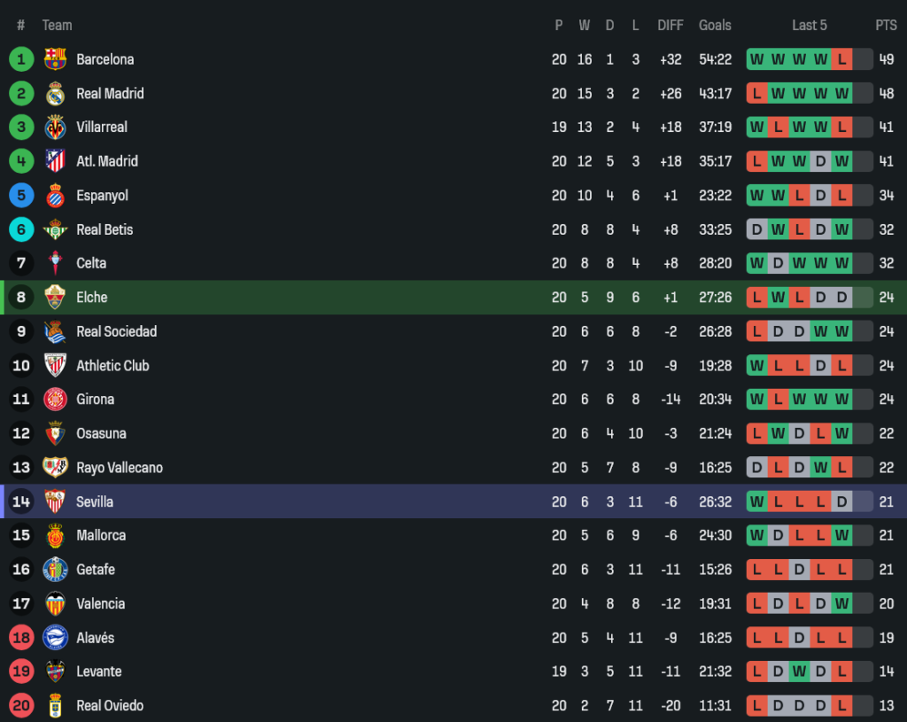 ตัดภาพไปที่ตารางคะแนน เอลเช่มี 24 แต้ม อยู่โซนกลางบน ยังมองเกมยุโรปได้แบบแอบหวัง ส่วนเซบีย่า 21 แต้ม รั้งกลางล่าง ฟอร์มช่วงหลังหลอนๆ แพ้บ่อย จนเกมนี้ต้องขอบคุณ อดัมส์ กับฟอร์มฮึดท้ายเกม ไม่งั้นกลับบ้านมือเปล่าแบบเมาหมัดแน่นอน
