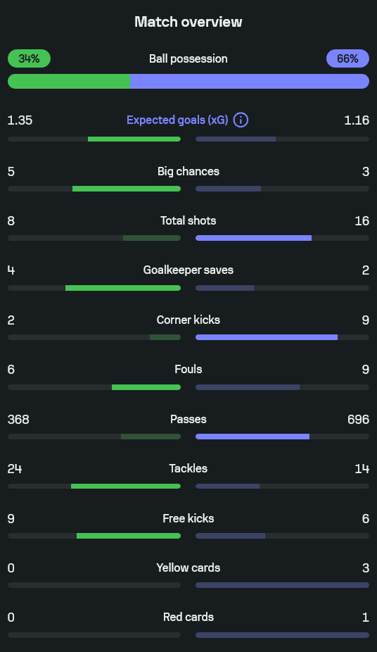 - xG เจ้าบ้าน 1.35 ส่วนทีมเยือน 1.16 ใกล้เคียงกัน แต่ความคมต่างกันลิบ