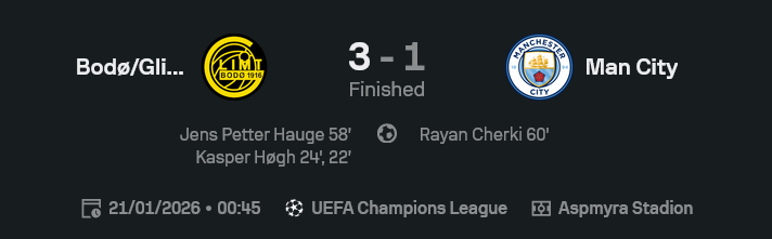 เกมนี้ในศึกยูฟ่า แชมเปี้ยนส์ ลีก 2025/26 ที่สนามหนาวจับกระดูกอย่างแอสป์ไมร่า สเตเดี้ยม กลายเป็นแมตช์ที่แฟนบอลต้องย้อนดู ไฮไลท์บอลวันนี้ กันยาว ๆ เพราะโบโด/กลิมท์เปิดบ้านยิงใส่แมนฯ ซิตี้ 3-1 แบบไม่เกรงใจดีกรีแชมป์เก่า แม้รูปเกมตามสไตล์บอลยุโรปสมัยใหม่จะบอกผ่านตัวเลขว่า “ซิตี้ครองบอล” แต่หน้า ผลบอลสด บอกชัดว่าคนที่จบคมกว่าคือเจ้าถิ่น จากลูกบวกของคาสเปอร์ ฮูกห์สองดอกรวด บวกเพิ่มอีกหนึ่งเม็ดจากเยนส์ ปีตเตอร์ เฮาเก้ ขณะที่เรอียง แชร์กี ตีไข่แตกให้ทีมเยือนแต่ไม่ทัน