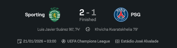 เกมนี้ที่เอสตาดิโอ โชเซ่ อัลวาลาด สปอร์ติ้ง ลิสบอนเปิดบ้านรับ เปแอสเช ในศึกยูฟ่า แชมเปี้ยนส์ ลีก 2025/26 กลายเป็นหนังคนละม้วนกับหน้าเว็บ ผลบอลสด เลยก็ว่าได้ เจ้าถิ่นวิ่งสู้ฟัดทั้งเกม ปล่อยให้ทีมเงินถังจากปารีสยืนต่อบอลอย่างหล่อ แต่สุดท้ายมาโดน หลุยส์ ฆาเบียร์ ซัวเรซ ใส่ทีเด็ดช่วงท้ายเกม กดสองเม็ดนาที 74 กับ 90 พลิกชนะ 2-1 ทั้งที่โดนบุกอยู่แทบจะฝ่ายเดียว ดราม่ายันสิ้นเสียงนกหวีด