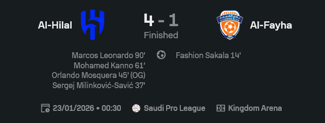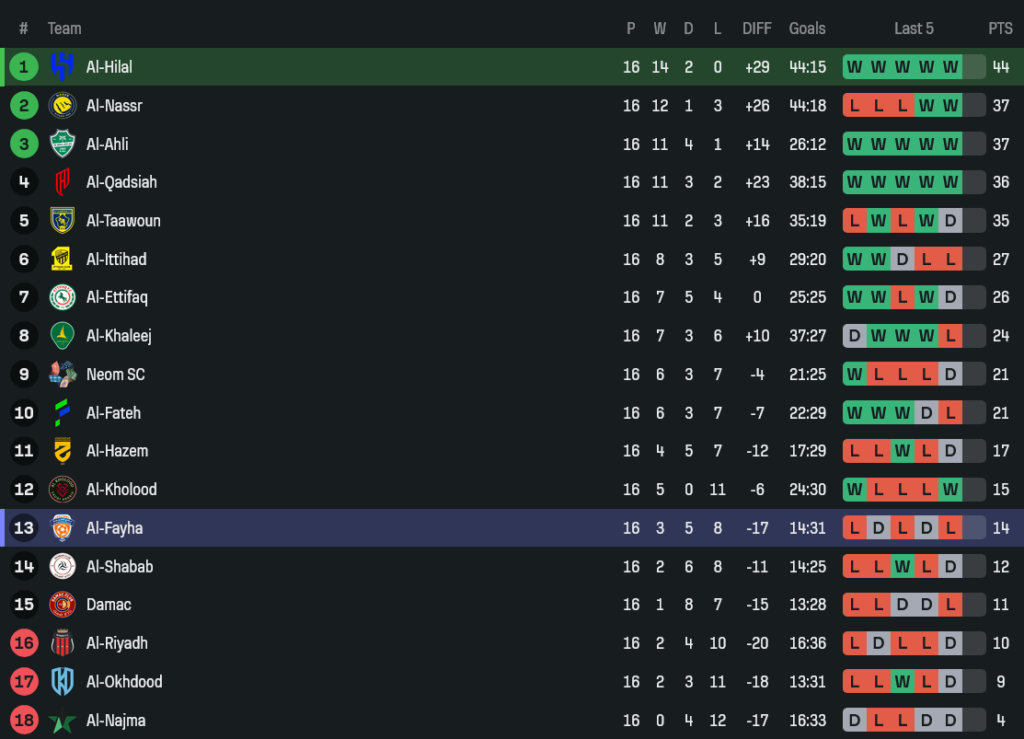 - หลังจบเกม อัล ฮิลาล นำโด่งที่ 44 แต้ม จาก 16 นัด ส่วน อัล ไฟฮา จมอันดับ 13 มี 14 แต้ม