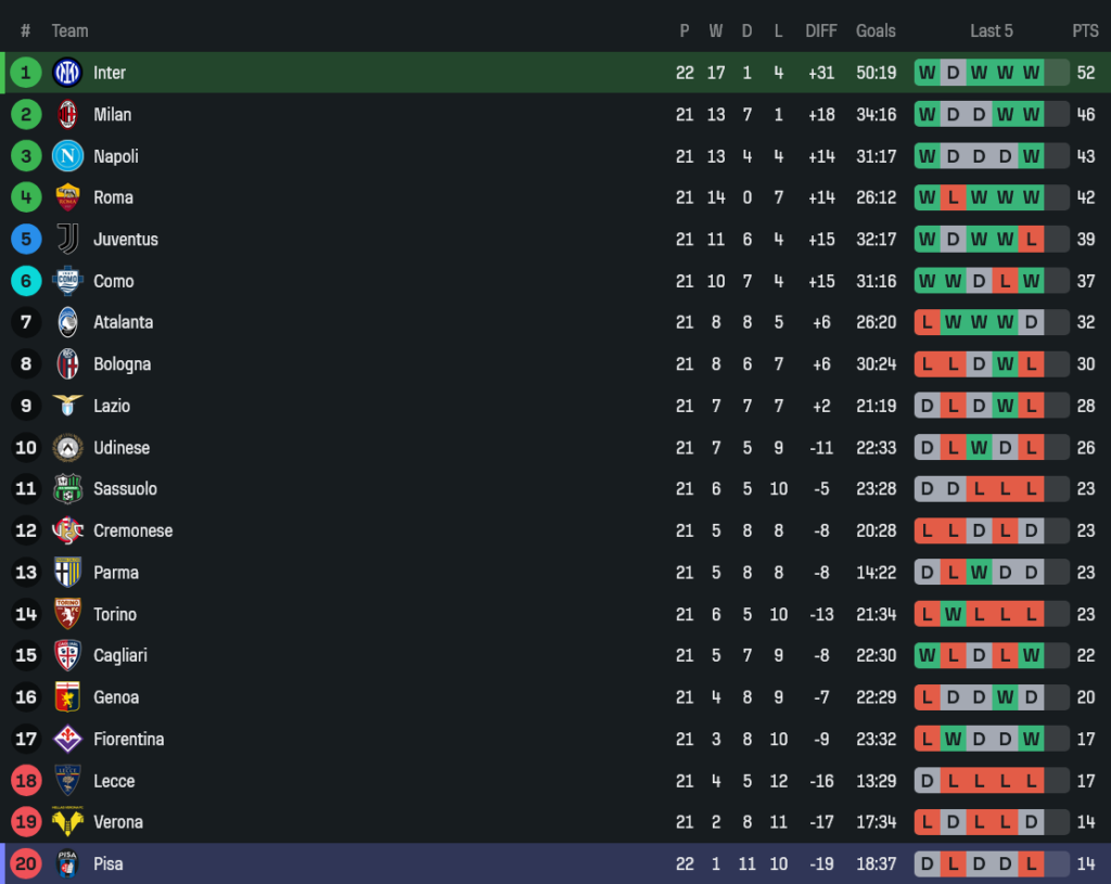 - ชัยชนะนัดนี้ทำให้อินเตอร์ยึดจ่าฝูงแน่น ขณะที่ปิซ่ายังต้องหนีตายต่อไปแบบเหนื่อยๆ