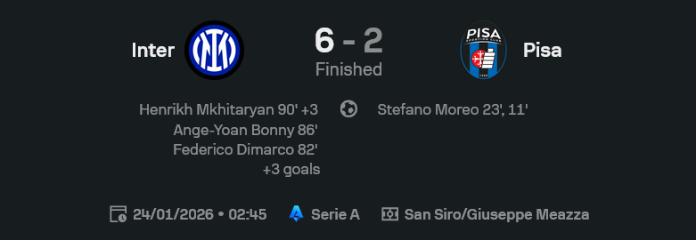 ฝั่งปิซ่าต้องชมว่าเริ่มเกมไม่กลัวชื่อชั้น กล้าเพรส กล้าบุก แต่พอเกมยืด ความลึกของขุมกำลังสู้ไม่ได้ พอโดนอินเตอร์แก้เกมกดดันต่อเนื่อง แนวรับเริ่มหลุดตำแหน่ง โดนยิงรัวเหมือนโดนเปิดโหมดซ้อมจบสกอร์ ข้อดีคือยังเห็นไอเดียเกมรุกจากโมเรโอที่ทำสองประตูได้สวยๆ