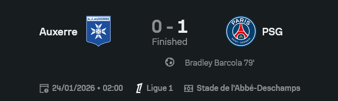 เกมลีกเอิง ฝรั่งเศส 2025/26 ที่สนามสต๊าด เดอ ลาเบ เดชองป์ เปลี่ยนบรรยากาศคืนหนาวให้ร้อนระอุทันที เมื่อจ่าฝูงอย่างเปแอสเชบุกเยือนโอแซร์ ทีมหนีตกชั้นที่ตั้งโซ่เหล็ก 5-4-1 หวังแบ่งแต้มให้ได้ สุดท้ายต้องรอถึงนาที 79 กว่าเปแอสเชจะเจาะสำเร็จจากจังหวะยิงหักข้อของแบรดลีย์ บาร์โกลา คว้าชัย 1-0 เก็บสามแต้มต่อยอดฟอร์มแรง ส่วนแฟนเจ้าบ้านคงได้แต่รีเฟรชสกอร์แบบเช็ก ผลบอลสด ไป ถอนหายใจไป