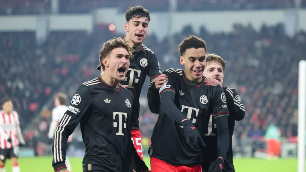 บาเยิร์นบุกชนะ PSV 2-1 จากประตูของมูเซียลานาที 58, ไซบารีตีเสมอนาที 78 ก่อนเคนยิงชัยนาที 84 พร้อมใบแดงของเมาโร จูเนียร์ช่วงทดเจ็บ ชัยชนะนัดนี้ทำให้ทีมของคอมปานีคว้าชัยในแชมเปียนส์ลีกเป็นนัดที่ 7 จาก 8 เกม และย้ำตำแหน่ง “อันดับสอง” ในรอบลีกเฟสเพื่อคว้าความได้เปรียบในรอบน็อกเอาต์ ขณะที่ PSV ต้องจบเส้นทางในรายการนี้