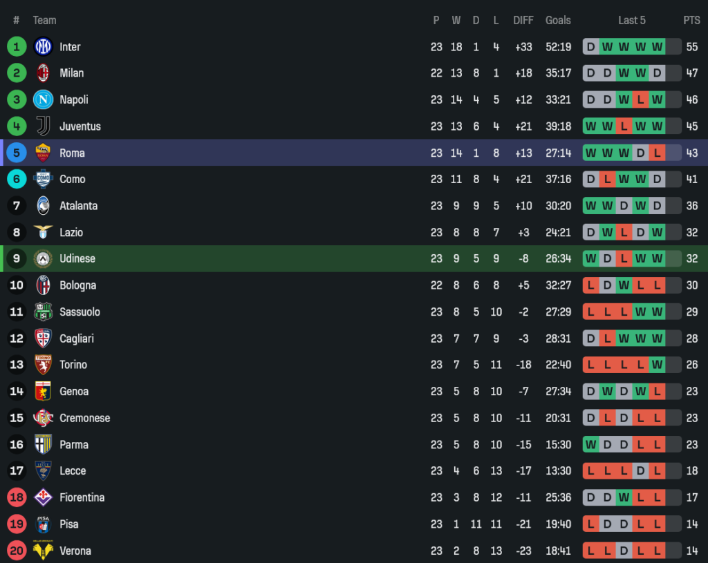 - หลังจบเกม: อูดิเนเซ่ขยับมี 32 แต้ม เท่าลาซิโอ ส่วนโรม่ายังติดอยู่ที่ 43 แต้ม พลาดจี้ยูเวนตุสในโซนท็อปโฟร์