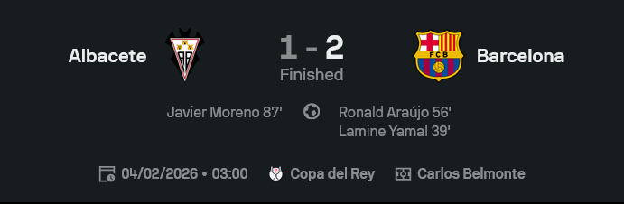 GOALSIAM ขอเล่าแบบไม่อ้อมค้อม—บาร์เซโลน่าบุกมาคุมเกมแทบทั้งสนาม ก่อนจะชนะอัลบาเซเต้ 2-1 ในศึกโกปา เดล เรย์ 2025/26 เกมนี้ดูเหมือนจะจบสวย ๆ แต่ดันมีดราม่าท้ายเกมให้คนดูต้องลุกจากโซฟาแบบหัวใจเต้นแรง ผล ผลบอล ออกมาบาร์ซ่ารอดตัวไปได้…แต่ทรงคือ “ครองบอลเยอะไม่ได้แปลว่าจบงานง่าย” นะจ๊ะ