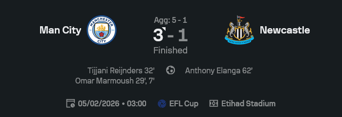 GOALSIAM ขอสรุปให้สั้นๆแบบคนดูบอลตัวจริง—เกมนี้แมนซิตี้ครองเกมเหมือนถือรีโมททีวีอยู่คนเดียว แต่ก็ไม่ได้สบายขนาดเดินเล่นนะ เพราะนิวคาสเซิ่ลก็มีจังหวะสวนให้เสียวเหมือนกัน สุดท้าย ผลบอลสด ออกมา 3-1 ที่เอติฮัด สเตเดียม (สกอร์รวมสองนัด 5-1)