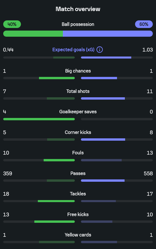 • ค่าคาดหวังประตู (xG): เจ้าบ้าน 0.44 – 1.03 ทีมเยือน