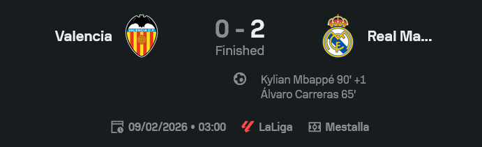 บาเลนเซียเองไม่ได้เล่นแย่ แต่ปัญหาคือเวลาจะเอาประตูมันไม่มีคนปิดสกอร์แบบคมๆ จังหวะใกล้เคียงสุดก็ยังติดบล็อกหรือติดเซฟไปหมด พอโดนนำก่อน เกมรับที่พยายามตั้งโซนก็เริ่มหลุด ทีนี้พอเหลือท้ายเกมแล้วดันดันสูงเกินไป ก็เปิดทางให้เอ็มบัปเป้ใช้สปีดจัดการปิดบัญชีเรียบร้อย ถือเป็นเกมที่มาดริดเล่นแบบผู้ท้าชิงแชมป์เต็มตัว ส่วนบาเลนเซียต้องกลับไปเคลียร์เกมรุกด่วน ไม่งั้นโปรแกรมข้างหน้ามีเสียวจริง