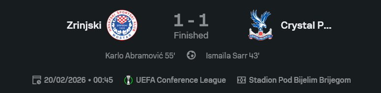 • โอกาสจะแจ้ง: ซรินสกี้ 0 | พาเลซ 1