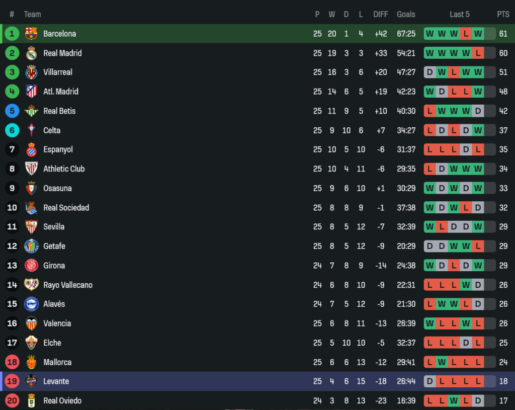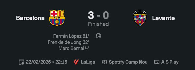 เดอ ยองก์คือคนที่ทำให้ทุกอย่างดูง่าย บอลถึงเท้าแล้วเกมเดินทันที ส่วนประตู 3-0 ของเฟร์มิน โลเปซ เป็นเหมือนประโยคปิดท้ายว่า “พอแล้ว กลับบ้านได้” ขณะที่ตารางคะแนนก็ชัด บาร์เซโลน่ายังยืนเบอร์ 1 (61 แต้ม) เหนือเรอัล มาดริดแต้มเดียว ส่วนเลบันเต้อยู่แถวรองบ๊วย ต้องรีบหาทางเอาตัวรอด