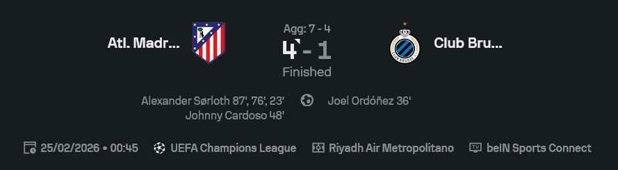 สรุปเกม ยูฟ่า แชมเปี้ยนส์ ลีก 2025/26 แอตเลติโก มาดริด 4-1 คลับ บรูช