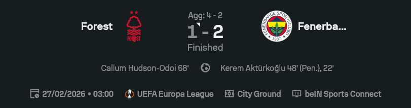 - เตะมุม ฟอเรสต์ 5 ครั้ง เฟเนร์บาห์เช่ 3 ครั้ง