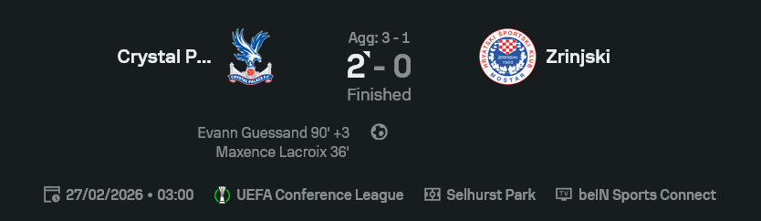ยูโรปา คอนเฟอเรนซ์ ลีก 2025/26 นัดนี้ คริสตัล พาเลซเปิดบ้านกดซรินสกี้ 2-0 เกมจริงเหมือนซ้อม วิ่งบี้ทั้ง 90 นาที เปิดหน้าแลกแล้วคุมจังหวะอยู่ข้างเดียว สุดท้ายหน้าเว็บ ผลบอลสด ขึ้นสกอร์ที่แฟนพาเลซอยากเห็น รวมสองนัด 3-1 เดินเข้ารอบสบาย ๆ