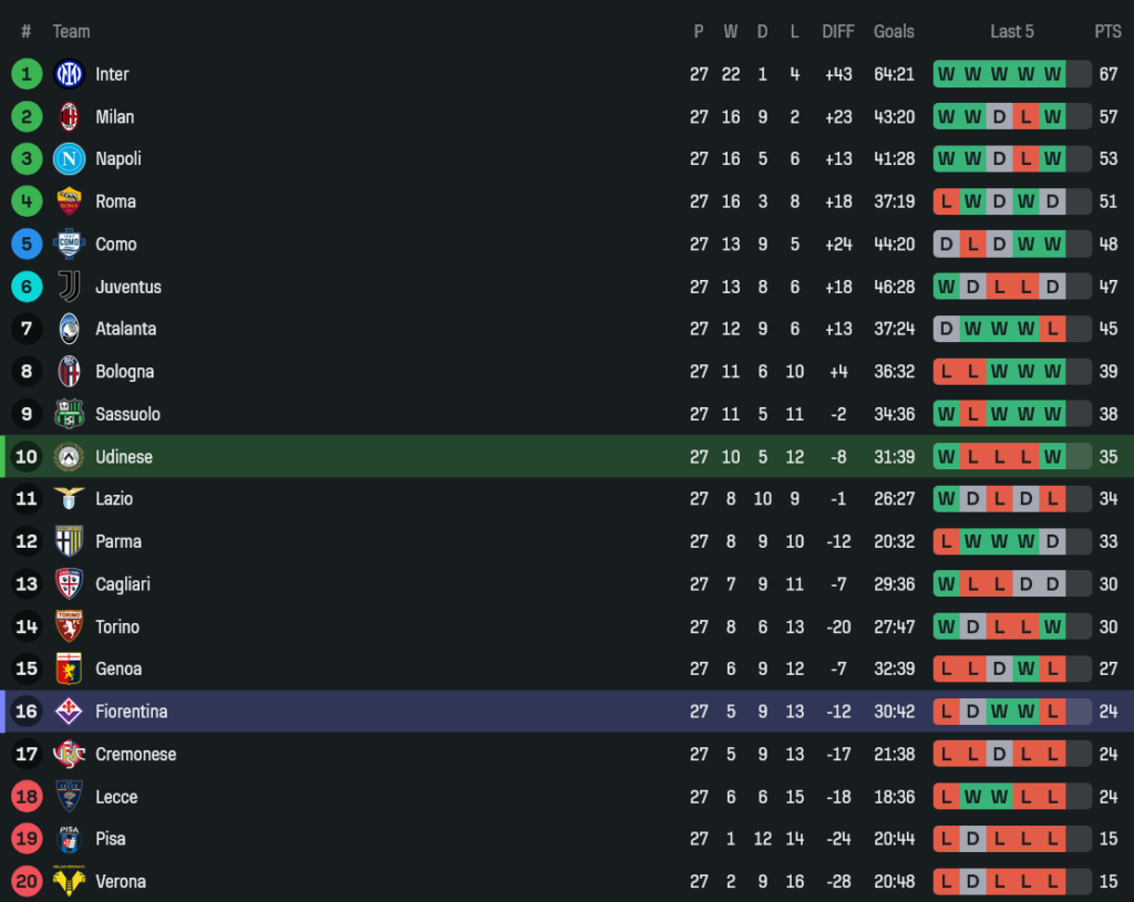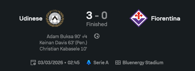 เกมนี้ ผลบอลสด มันฟ้องชัดว่า อูดิเนเซ่ไม่ได้ชนะเพราะดวง แต่ชนะเพราะ “คมกว่า โหดกว่า และทำการบ้านมาดีกว่า” กดฟิออเรนติน่า 3-0 ทั้งที่รูปเกมครองบอลฝั่งม่วงเยอะกว่า แต่พอเข้าพื้นที่อันตรายทีไร เหมือนเปิดประตูเจอป้าย “ห้ามผ่าน” ทุกที