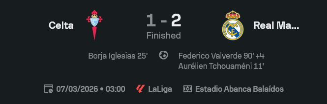 เกมนี้มันทรง “ทีมเยือนครองบอลแต่เจ้าบ้านกัดไม่ปล่อย” ชัดๆ เซลต้ากัดตั้งแต่วินาทีแรก แล้วมาดริดก็มาได้ทีจากลูกเซ็ตพีซ ก่อนจะโดนตีเสมอ สุดท้ายจบด้วยลูกยิงไกลแบบไม่ต้องขออนุญาตโลกของ บัลเบร์เด้ ในนาทีทดเจ็บ เอา 3 แต้มกลับบ้านแบบหน้าตาเฉย แต่แฟนบอลนี่เหงื่อท่วม