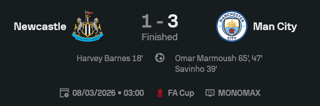 ศึก เอฟเอ คัพ อังกฤษ 2025/26 คู่นี้จบแบบที่สกอร์บอกทุกอย่างในหน้า ผลบอลสด เมื่อ แมนเชสเตอร์ ซิตี้ บุกมาสอนบอล นิวคาสเซิ่ล ยูไนเต็ด 3-1 ทั้งที่เจ้าถิ่นออกตัวได้ก่อนจาก ฮาร์วีย์ บาร์นส์ นาที 18 แต่พอซิตี้ตั้งเกมติดเมื่อไร เกมก็เริ่มไหลเหมือนก๊อกน้ำรั่วทันที ก่อนโดน ซาวินโญ่ ตีเสมอ และ โอมาร์ มาร์มูช จัดการเหมาสองเม็ดพาทีมเยือนปิดงานแบบไม่ต้องลุ้นให้เหนื่อย