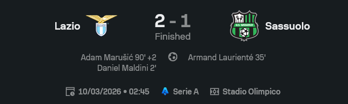 - นาที 90+2 อดัม มารูซิช โขกประตูชัยให้ลาซิโอชนะ 2-1