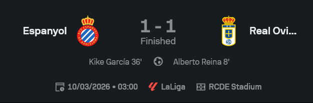 เอสปันญ่อลเปิดบ้านเสมอ เรอัล โอเบียโด้ 1-1 ในเกมที่เจ้าถิ่นเป็นฝ่ายขึงใส่แทบตลอด แต่จบสกอร์กันไม่คมพอ ถ้ามองแค่ ผลบอลสด อาจดูเหมือนสูสี แต่รูปเกมจริงฝั่งเอสปันญ่อลเหนือกว่าชัด เจอปัญหาเดียวคือบุกเยอะ ยิงเยอะ แต่เก็บสามแต้มไม่ได้