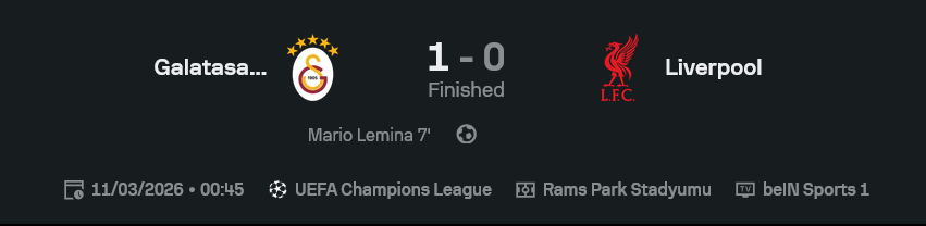 เกมนี้ภาพมันชัดมาก ลิเวอร์พูลมีทรง มีจังหวะ มีพื้นที่ แต่ไม่มีความคม จบสกอร์กันเหมือนลืมพกปลายมีดมา ส่วนกาลาตาซารายเล่นแบบรู้ว่าอะไรคือจุดขาย เน้นลูกตั้งเตะ เอาความแน่นเข้าสู้ และมีผู้รักษาประตูช่วยปิดบัญชีให้ครบ สูตรมันเลยออกมาเป็นบอลถ้วยแท้ๆ ที่ไม่ได้สวยหรูแต่ได้ผลจริง