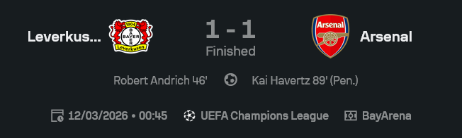ยูฟ่า แชมเปี้ยนส์ ลีก 2025/26 เกมนี้จบแบบแฟนบอลมีบ่นแน่ เลเวอร์คูเซ่นออกนำก่อนจาก โรเบิร์ต อันดริช แต่สุดท้าย อาร์เซนอล มาตามตีเสมอ 1-1 จากจุดโทษของ ไค ฮาแวร์ตซ์ ช่วงท้ายเกม ทำให้ ผลบอลสด คู่นี้ลงเอยแบบแบ่งแต้มชนิดที่เจ้าถิ่นเสียดาย ส่วนทีมเยือนก็ยังไม่ได้ดีพอให้ปรบมือดังนัก