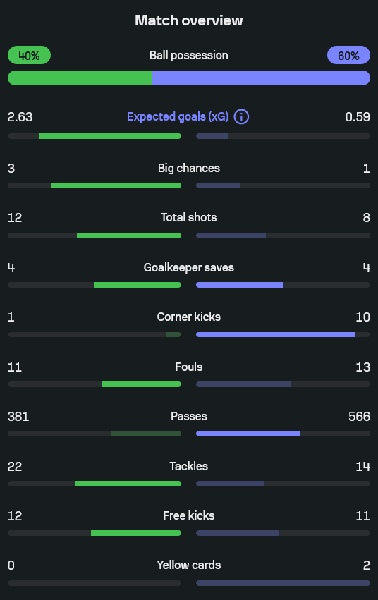 - ซิตี้ครองบอล 60 เปอร์เซ็นต์ แต่มาดริดมี xG ดีกว่า 2.63 ต่อ 0.59