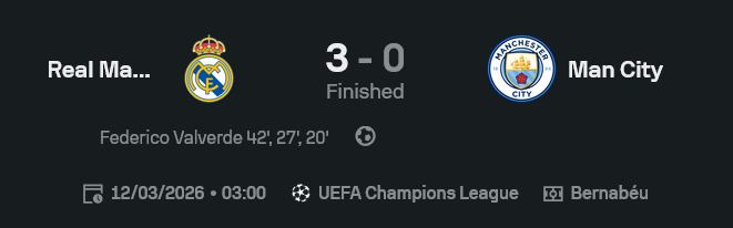 เกมนี้คือบทเรียนของทีมที่ครองบอลสวยแต่ไม่คม มาดริดไม่ได้ต่อบอลเยอะกว่า แต่เล่นทุกจังหวะแบบมีเขี้ยว มีพื้นที่เมื่อไรใส่ทันที ต่างจากซิตี้ที่รูปเกมดูดี แต่หน้าเขตโทษเหมือนคิดเยอะเกินไป สรุปแบบ วิเคราะห์บอล ตรง ๆ คือ มาดริดเฉียบกว่า หนักแน่นกว่า และปิดเกมได้แบบทีมใหญ่ของจริง