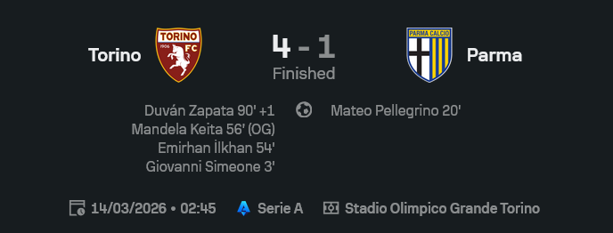 ศึกกัลโช่ เซเรีย อา 2025/26 คู่นี้ ผลบอลสด ออกมาแบบครึ่งแรกยังสูสี แต่ครึ่งหลังโตริโน่กดคันเร่งทีเดียว ปาร์ม่าหลุดยาว ก่อนเจ้าถิ่นปิดเกม 4-1 แบบคนดูรู้เลยว่าใครคมกว่า