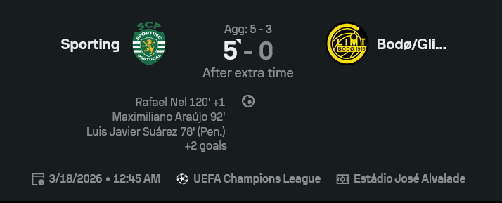 ศึก ยูฟ่า แชมเปี้ยนส์ ลีก 2025/26 เกมนี้ ผลบอลสด ออกมาชนิดไม่ต้องตีความเพิ่ม สปอร์ติ้ง ลิสบอนเหนือกว่าทุกมุม ไล่กดโบโด กลิมท์ 5-0 หลังต่อเวลาพิเศษ ครองบอลข่ม บุกใส่ไม่พัก และจบสกอร์ได้เฉียบกว่าชัดเจน