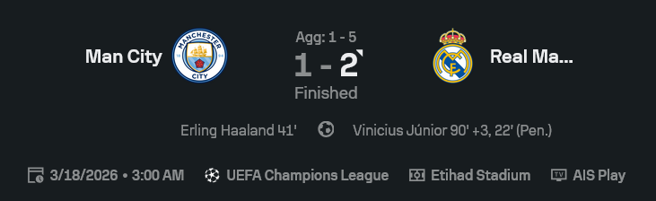 • นาที 93 วินิซิอุส ซัดประตูชัย 2-1 ดับซิตี้คาเอติฮัด