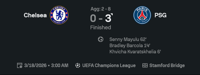 • เชลซียิง 18 ครั้ง เปแอสเชยิง 8 ครั้ง