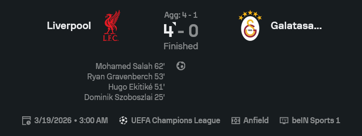 ศึก ยูฟ่า แชมเปี้ยนส์ ลีก 2025/26 เกมนี้ลิเวอร์พูลเล่นเหมือนเปิดโหมดไล่ล่า กดกาลาตาซารายแทบเงยไม่ขึ้น ก่อนปิดจ็อบด้วยสกอร์ ผลบอลสด 4-0 แบบขาดทุกมุม ทั้งรูปเกม ความเร็ว และความเด็ดขาดในพื้นที่สุดท้าย